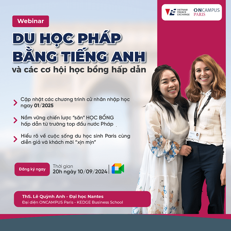 Nhằm giúp các bạn ứng viên có một lộ trình du học tối ưu nhất, VFE và ONCAMPUS – chương trình trực thuộc Tập đoàn Cambridge Education, sẽ cùng phối hợp tổ chức sự kiện Webinar: “Du học Pháp bằng tiếng Anh và các cơ hội học bổng hấp dẫn” ngay trong tháng 09 tới đây.